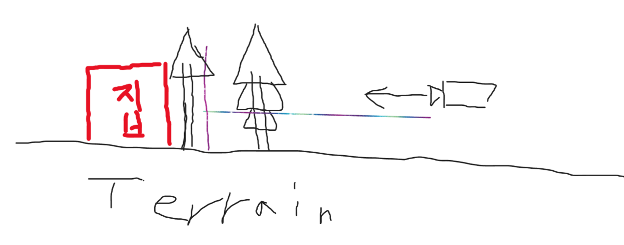 그림으로 적당히 표현하면 집은 Terrain 컴포넌에 등록하지 않은 Mesh였기에 Terrain Culling 규칙이 걸리지 않는 오브젝트입니다.